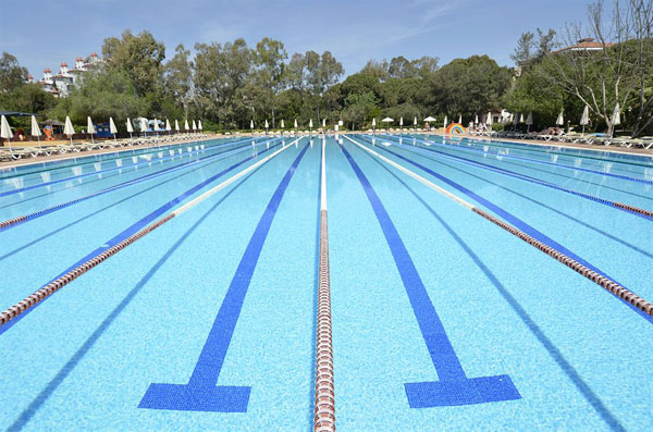 國際及國家級競賽游泳池應(yīng)為50m(長)×25m(寬)×2m(深),10條泳道。國家級及省(市)級競賽池也可為50m(長)×21m(寬)×2m(深),8條泳道,兩端池壁自水面上30cm至水面下80cm長度范圍內(nèi)的長度誤差在安裝自動計(jì)時觸版后,應(yīng)為0.00~0.01m。